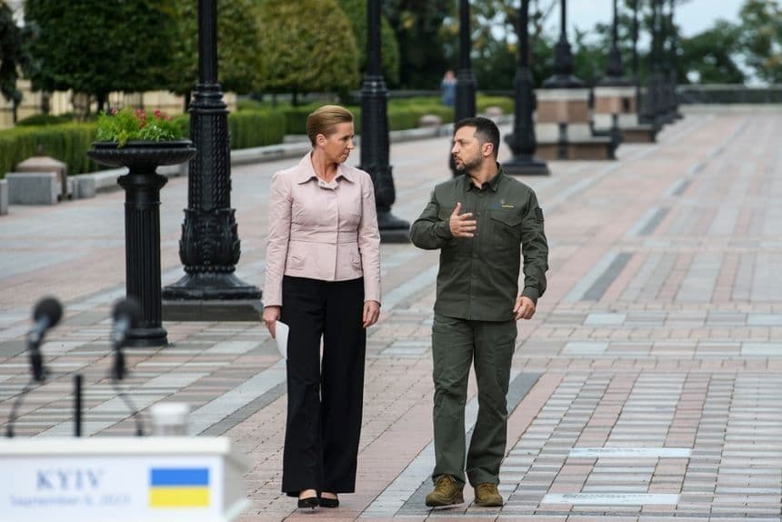 Prime Minister of Denmark Mette Frederiksen (left) and Ukrainian President Volodymyr Zelensky (right) at a joint press conference in Kyiv in 2023. (Paparazzza/Shutterstock)