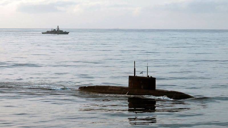 HMS Iron Duke (far left) monitoring the surfaced Russian Kilo-class submarine Novorossiysk. (UK MoD Crown Copyright 2025)