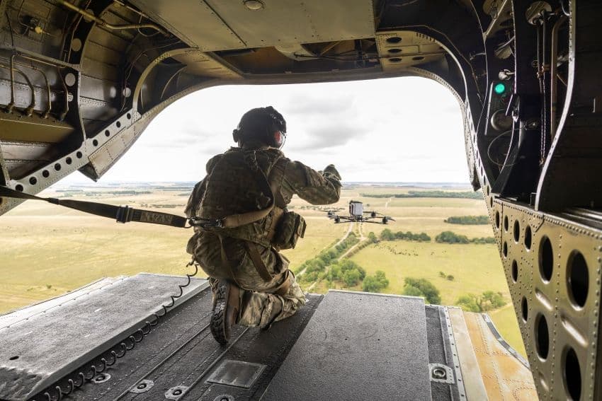 A small drone launched from a Chinook during exercise Hornets String in July 2025. (UK MoD Crown Copyright 2025)