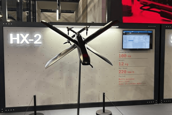 Helsing's HX-2 drone, pictured at DSEI UK 2025. (DSEI Gateway)