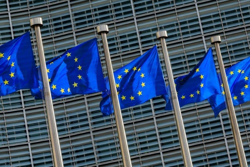 EU flags flying outside the headquarters of the European Commission. (Christophe Licoppe/Shutterstock)